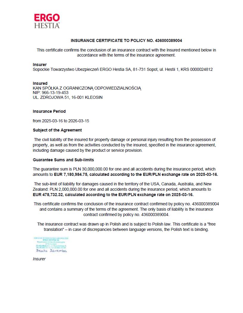 The KAN Co. is insured for an amount of EUR 7.180.985 to cover all possible customers' claims, which may ensure from the guarantee provisions.